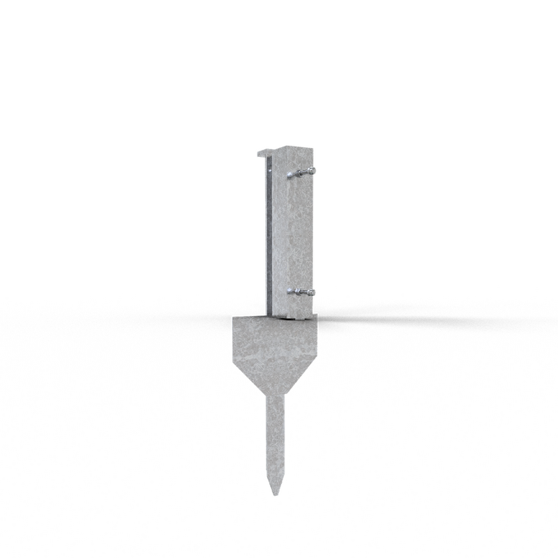 Stabiler Erdspieß nach TL, Typ Standard 60, zum Einstecken von 60 x 60 mm und Ø 60 mm Schaftrohren. Das angespitzte T-Profil mit aufgeschweißtem Schlagblech ermöglicht ein sicheres Einschlagen ins Erdreich. Ein Trapezblech verhindert Torsion, zwei Stellschrauben fixieren das Schaftrohr im Aufnahmestutzen.