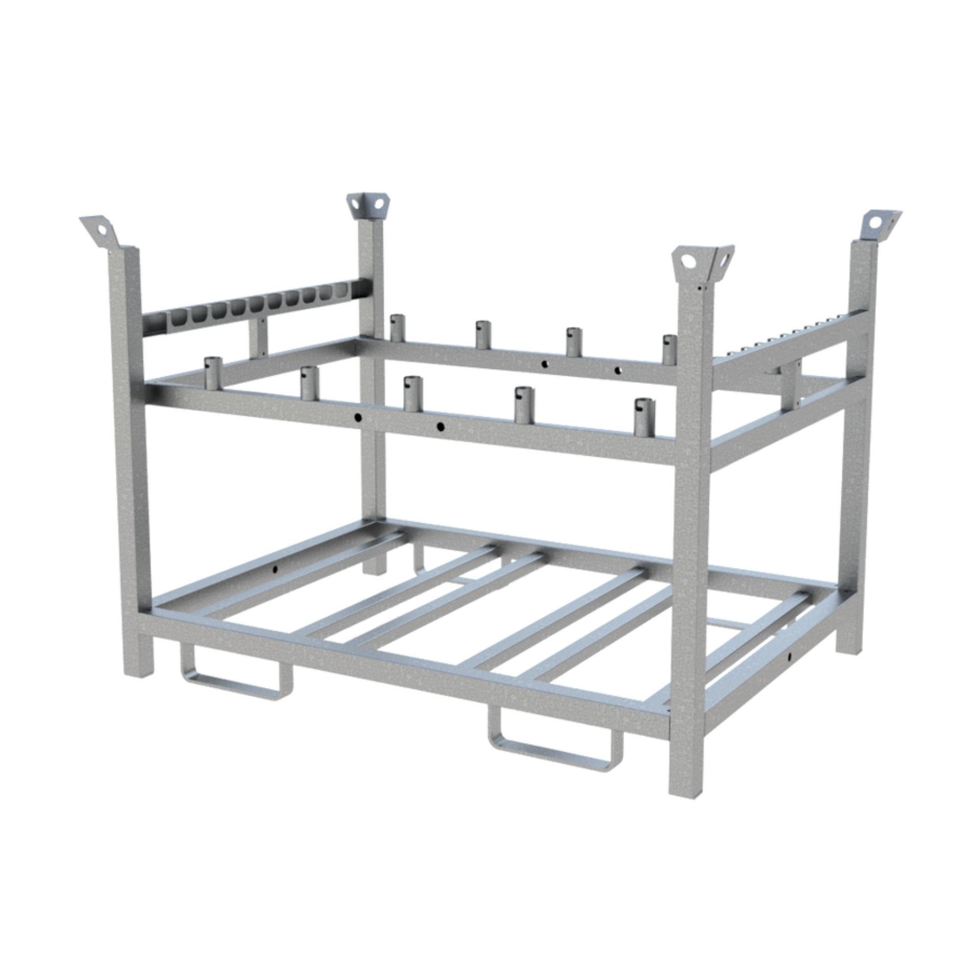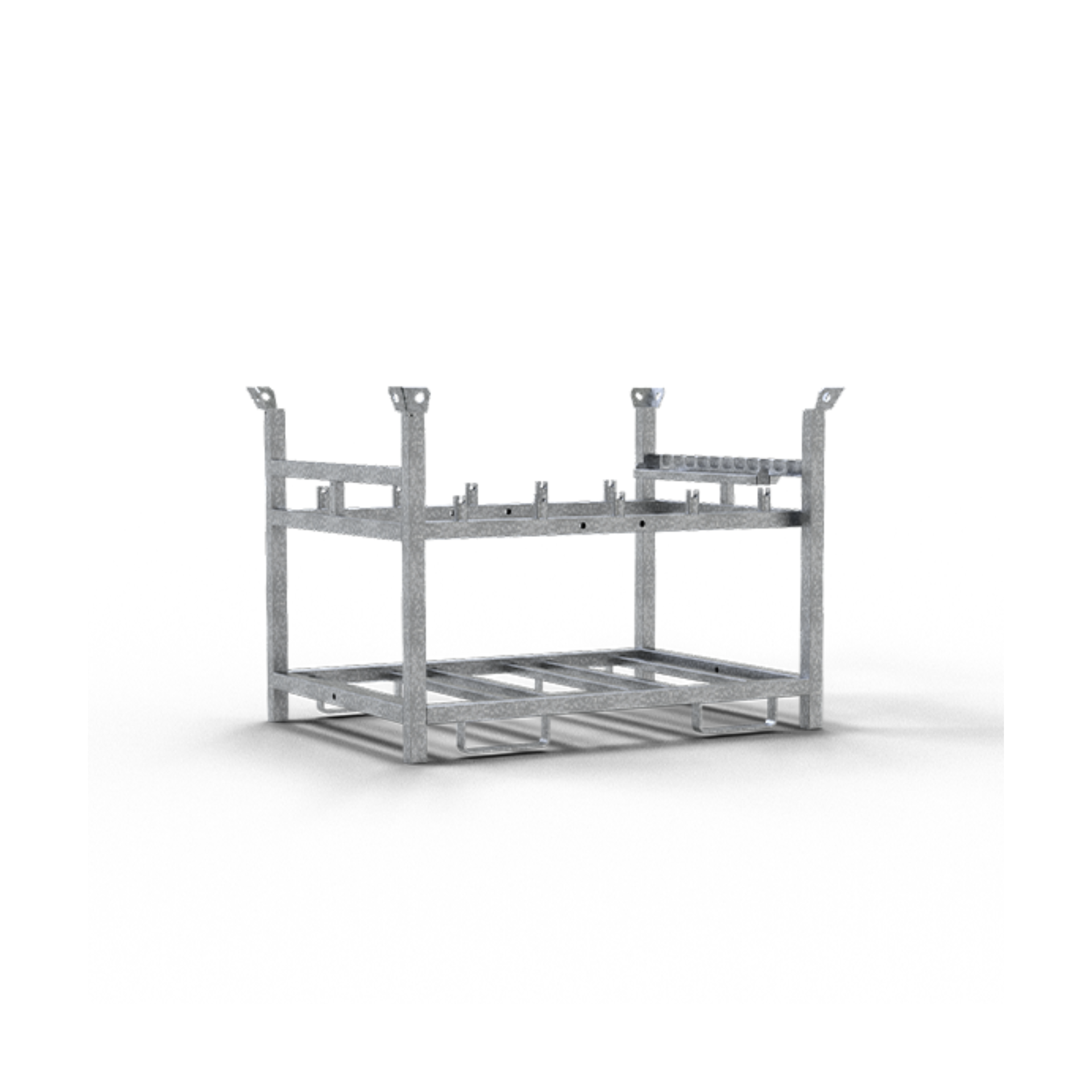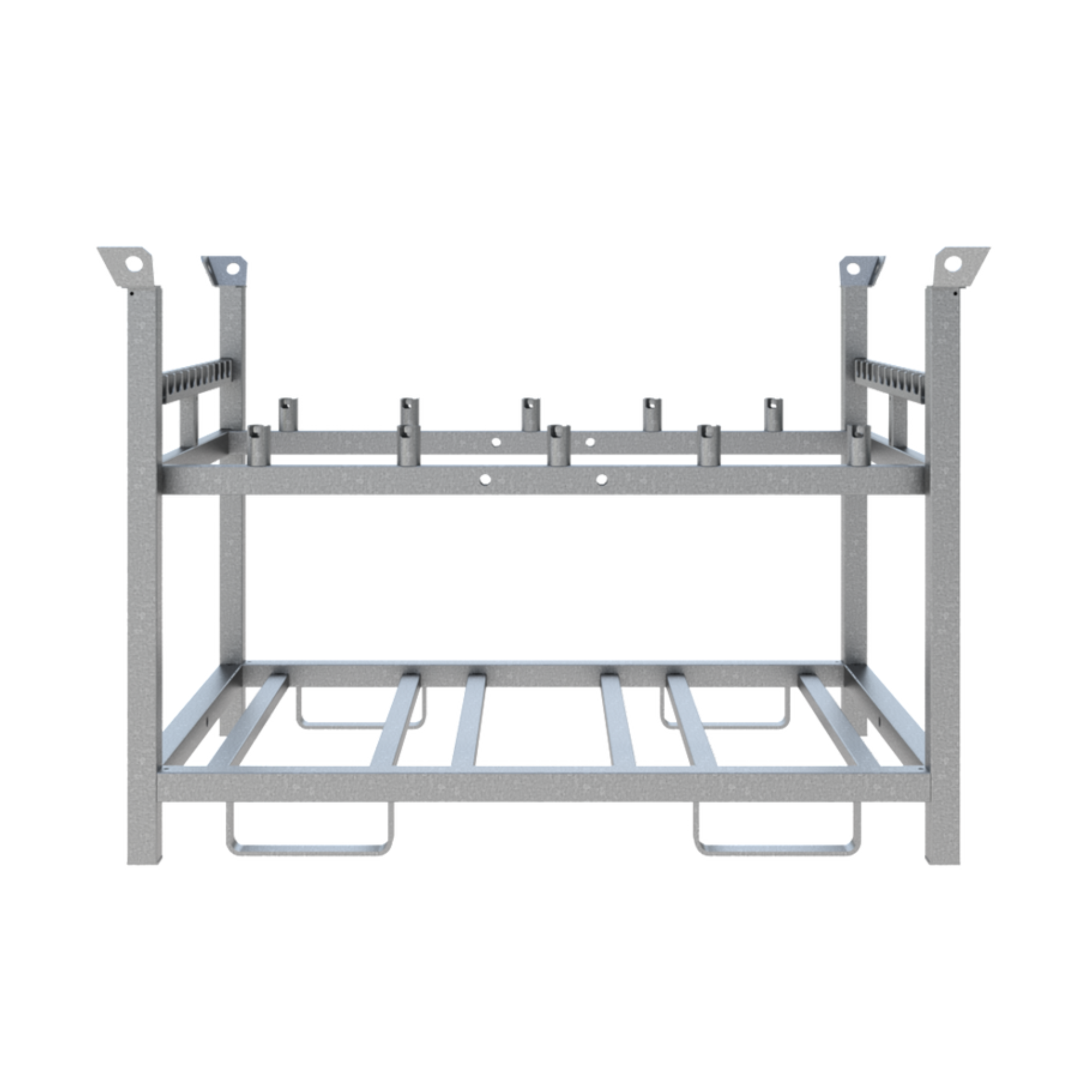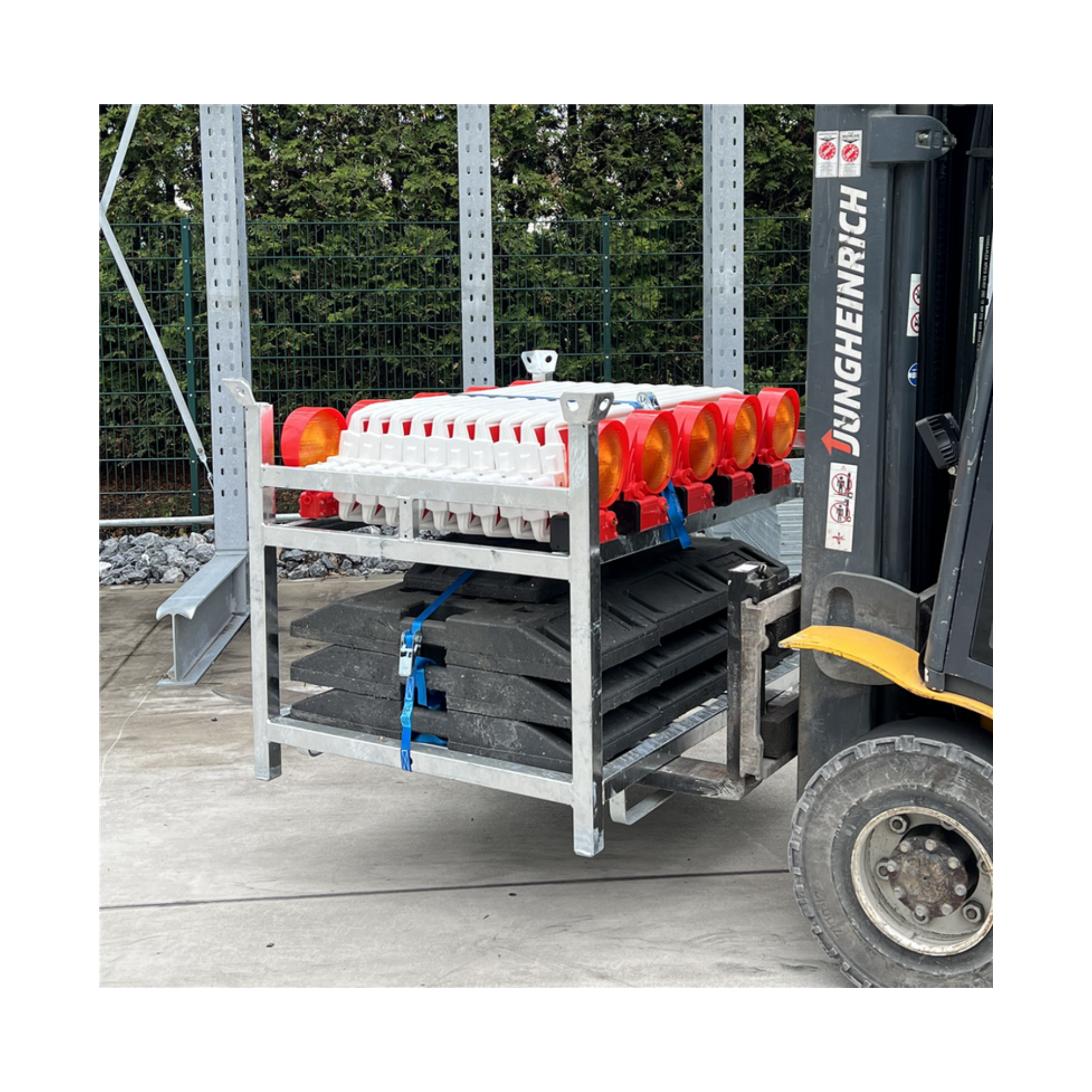 Robuste Stahlpalette für die strukturierte Lagerung und den sicheren Transport von bis zu 10 TL-Fußplatten, 10 Bakenleuchten und 10 Baken. Die feuerverzinkte Ausführung eignet sich für Stapler- und Kranbetrieb und ist auch als Komplett-Set verfügbar.