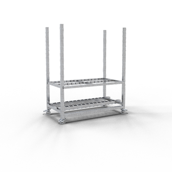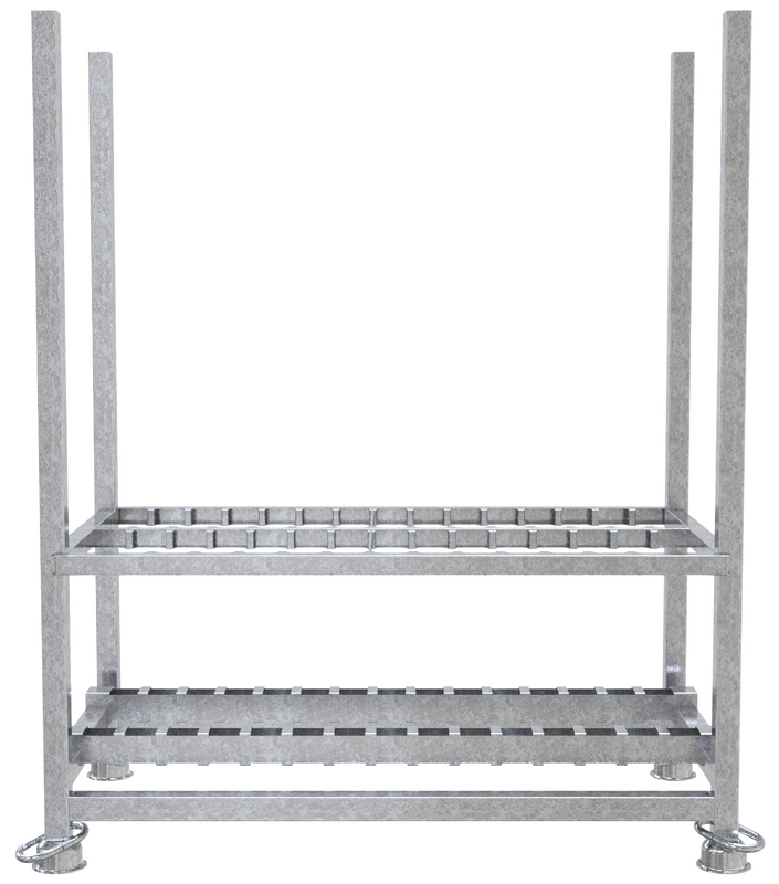 Robuste Stahlpalette zur stehenden Aufnahme von bis zu 30 BAST-Wendebaken. Jede Bake wird in einem speziell geformten Konturausschnitt platziert – für optimale Übersicht, schnelles Be- und Entladen und sichere Handhabung. Ideal für den Kran- und Staplerbetrieb.