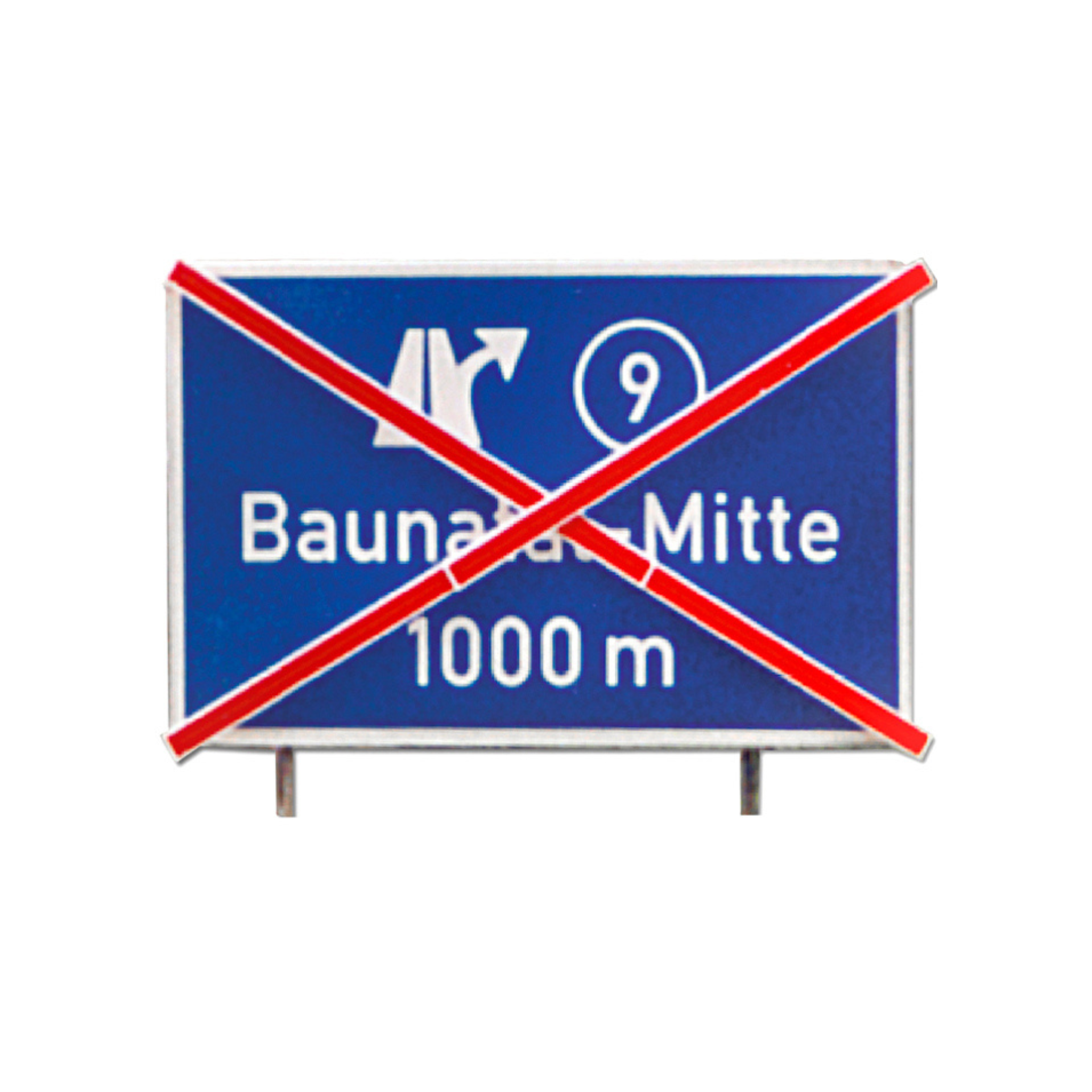 Robuste Auskreuzvorrichtung zur temporären Außerbetriebnahme von Großschildern, Wegweisern und Überkopf-Beschilderungen. Ideal für Autobahn- und Schnellstraßenbereiche.