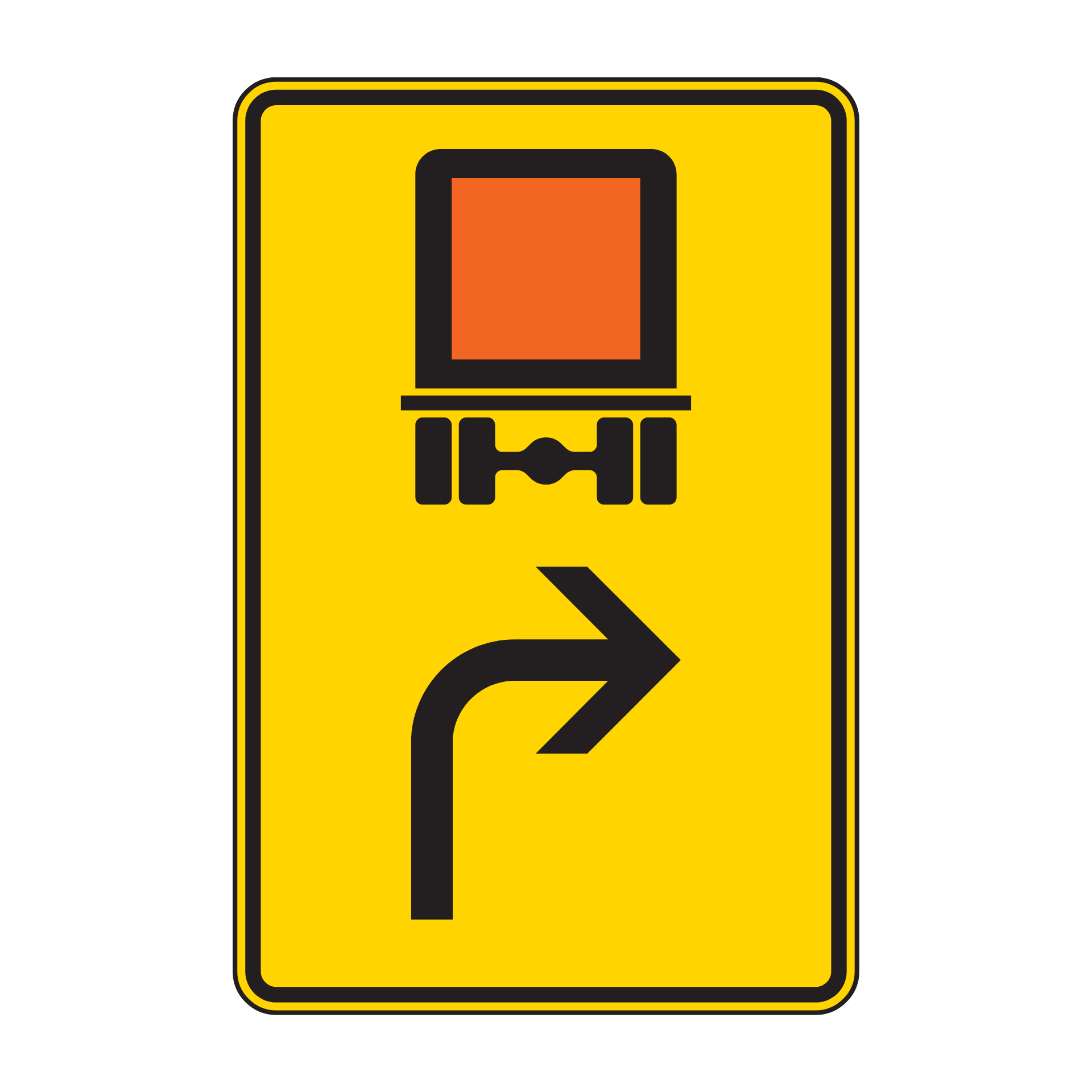 Das Verkehrszeichen 442-21 weist kennzeichnungspflichtige Fahrzeuge mit gefährlichen Gütern im Voraus auf eine rechtsweisende Fahrtrichtung hin. Es wird zur sicheren Führung solcher Transporte vor Abzweigungen oder innerhalb von Kreisverkehren eingesetzt.