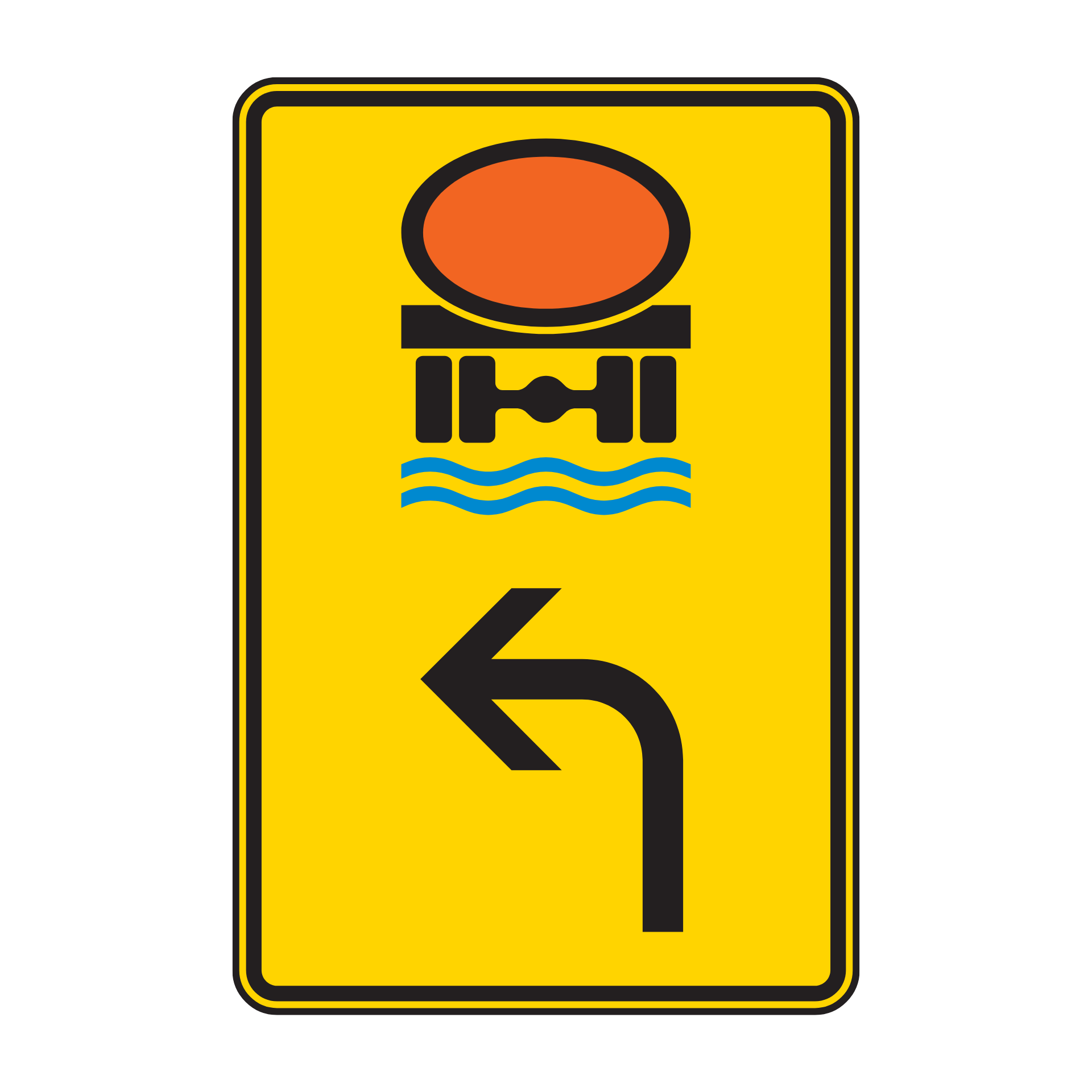 Das Verkehrszeichen 442-12 weist Fahrzeuge mit wassergefährdender Ladung im Voraus auf eine linksweisende Fahrtrichtung hin. Es dient der gezielten und sicheren Verkehrslenkung vor Abzweigungen oder Kreisverkehren.